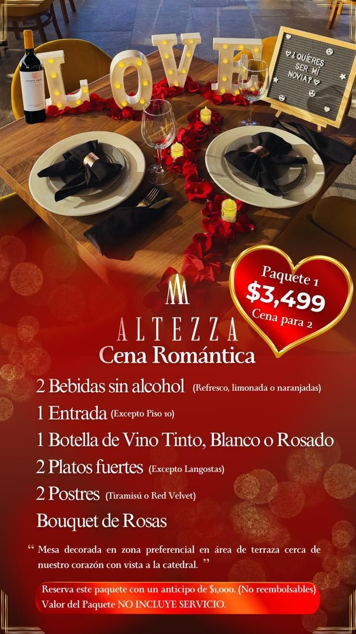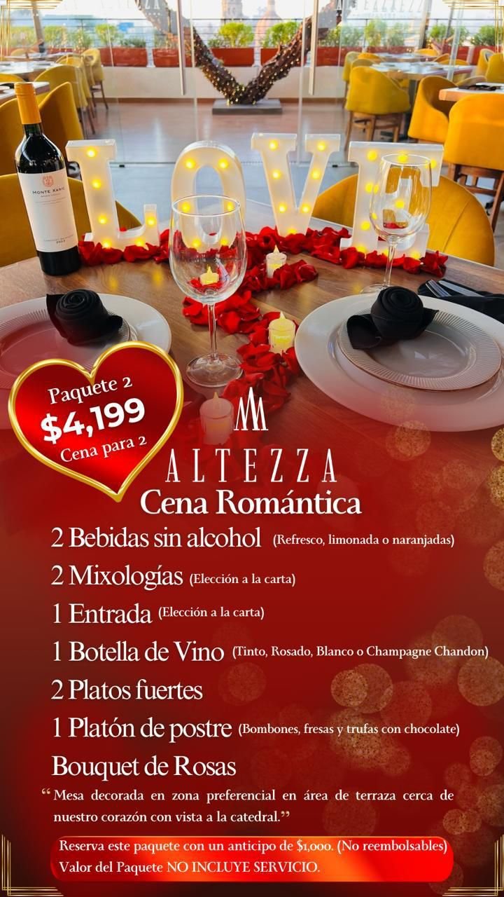 Disfruten una velada íntima con entrada, vino, platos fuertes, postres y un bouquet de rosas, en una mesa decorada junto a nuestro corazón con vista a la Catedral.